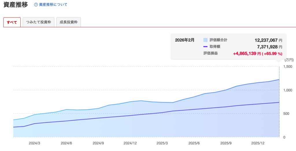 2026年2月時点のNISAの資産残高は以下の通り。(記事執筆時の最新を記載しているので末日とズレてることがあります!)